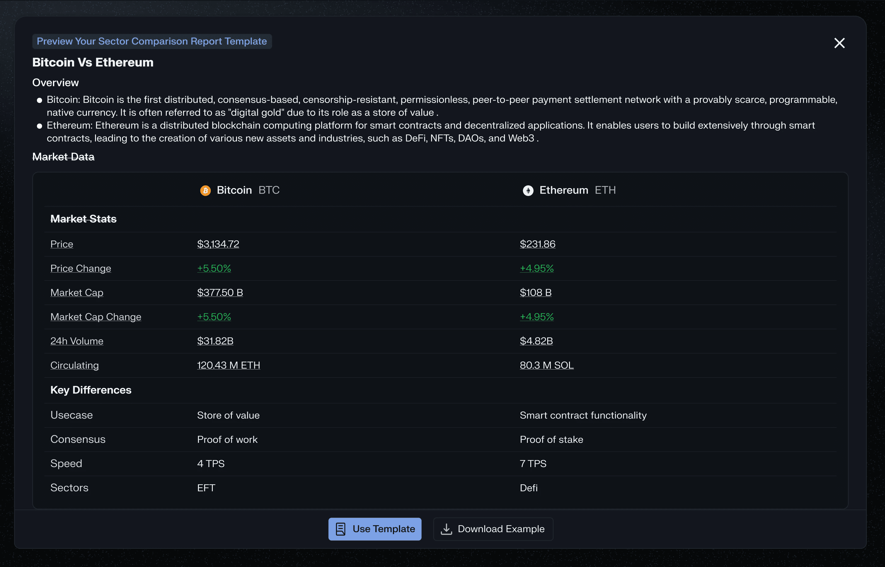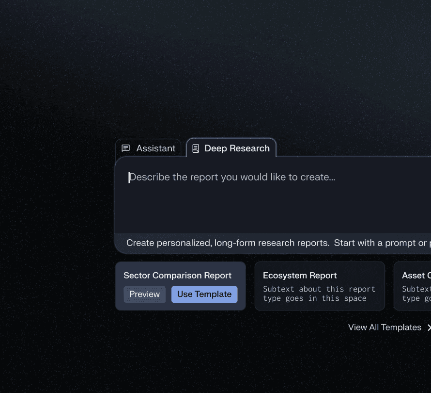 One of the most strategically important design decisions was the template system. Rather than requiring users to craft the perfect prompt from scratch, I designed structured templates that encode Messari's institutional research frameworks — Sector Comparison Reports, Ecosystem Reports, Asset Comparison Reports, Asset Due Diligence, and Periodic Project Recaps.