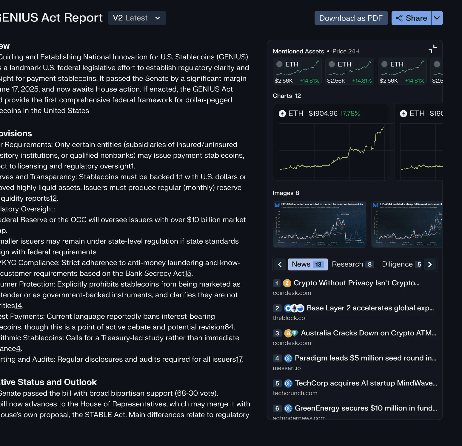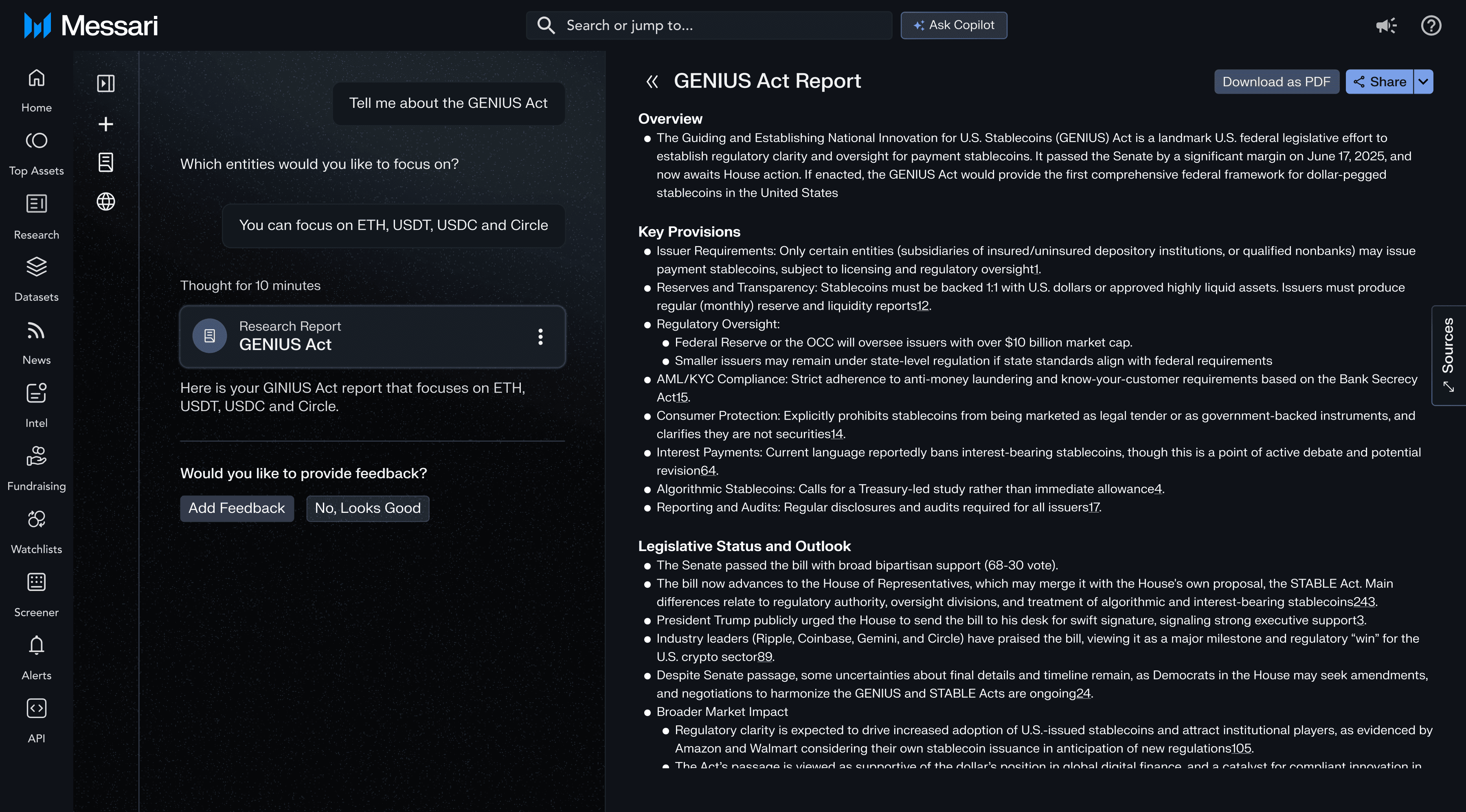 "The sidebar is what makes this feel like Messari instead of just another AI wrapper. Seeing the actual chart data and news citations alongside the report — that's the trust signal our users need."