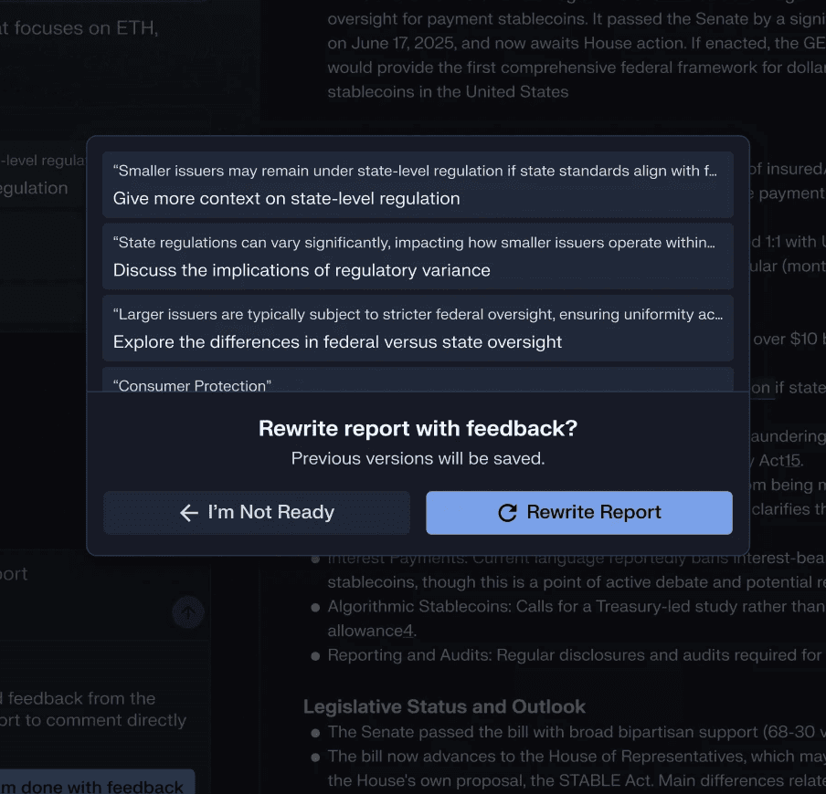 The core design challenge was creating a flow that felt seamless across three distinct phases: report initiation, generation with real-time feedback, and post-generation refinement. Each phase had its own interaction model and constraints.